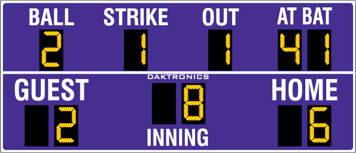 This outdoor LED baseball/softball scoreboard displays HOME and GUEST scores to 99, INNING to 19, BALL to three, STRIKE to two, OUT to two and AT BAT to 99. Scoreboard shows AT BAT to 99, but can also display H/E (hit or error), TIME or PITCH COUNT instead.