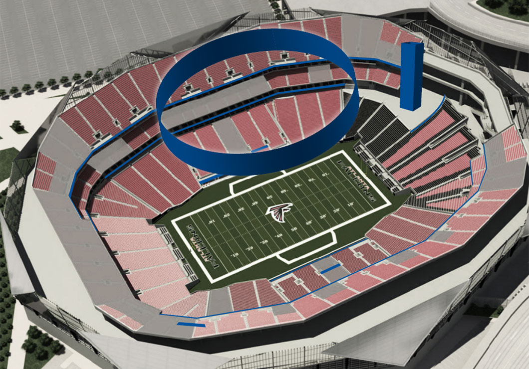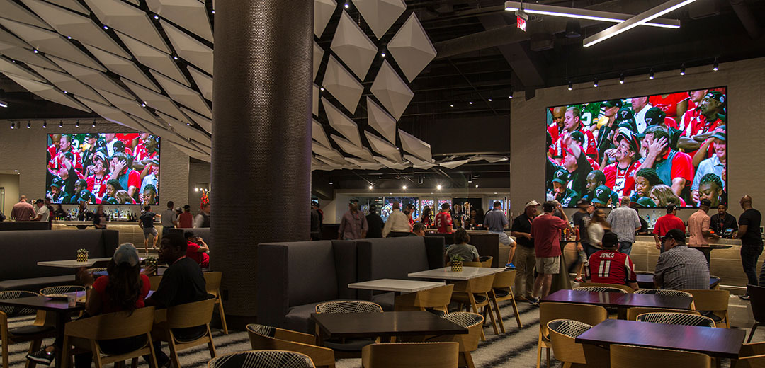 A total of 16 displays combine for more than 83,500 square feet throughout Mercedes-Benz Stadium to provide fans with an immersive experience that is unique, memorable and unparalleled. From the unprecedented Halo display to the Mega Column display to the uniquely-shaped Feather Wall display to the club displays, Mercedes-Benz Stadium offers more LED real estate than any other stadium in the world and provides the ultimate game-day experience like nothing else available in sports.